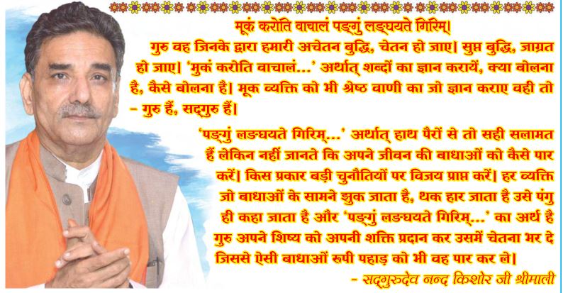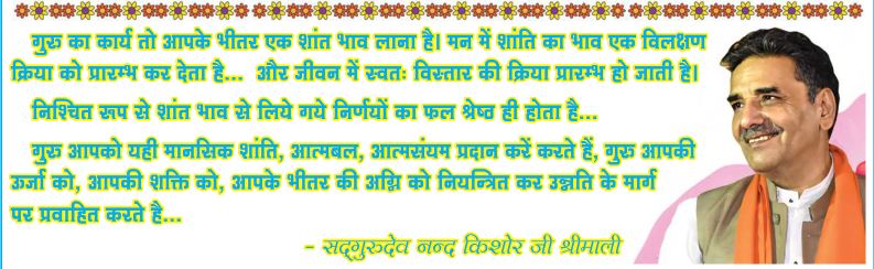 After passing thousands of rigorous tests and performing extremely tough Sadhnas in the Himalayas, Revered Gurudev Nand Kishore Shrimaliji, Gurudev Kailash Chandra Shrimaliji, and Gurudev Arvind Shrimaliji were elevated into the Gurupad in Chaitra Navratri, 1993, whence Reverent Gurudev Dr. Narayan Dutt Shrimaliji transferred His spiritual energy into Them. In June 1998, Gurudev Dr. Narayan Dutt Shrimaliji announced that Gurudev Nand Kishore Shrimaliji, Gurudev Kailash Chandra Shrimaliji, and Gurudev Arvind Shrimaliji will handle all His responsibilities from then on. Subsequently, Revered Gurudev Nand Kishore Shrimaliji, Revered Gurudev Kailash Chandra Shrimaliji and Revered Gurudev Arvind Shrimaliji have been shouldering all the responsibilities and guiding the disciples after Third July 1998, when Reverent Gurudev Dr. Narayan Dutt Shrimaliji left for Siddhashram. He is the chief controller of Siddhashram as Reverent Paramhans Swami Nikhileshwaranandji. This work is surely against the tides of the times and is truly amazing in itself. Diksha and Sadhanas have blown in fragrant breezes in the lives of many despaired and frustrated men and women.
